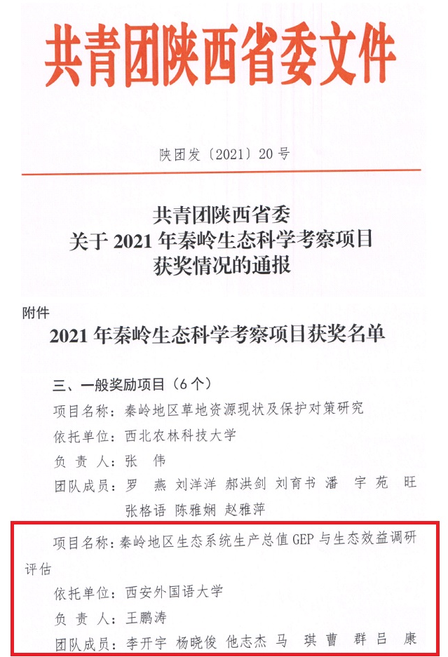 近日,共青团陕西省委办公室发文公布陕西省2021年秦岭生态科学考察项目获奖情况,威尼斯官网青年教师、陕西省秦岭生态环保“青年学者”王鹏涛获评本年度共青团陕西省委一般奖励项目,获得资助经费两万元。