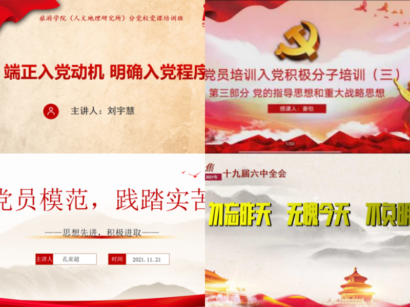 11月25日至11月28日,辅导员刘宇慧、学生第四党支部书记胡森文、学生第一党支部书记焦议、学生第三党支部书记孔亚超、学生第二党支部书记秦怡,分别以“端正入党动机,明确入党程序”“百年奋斗路 启航新征程”“十九届六中全会精神解读分享”“学党员模范,践踏实苦干”“党的指导思想和重大战略思想”为主题开展党课培训,以端正入党动机为契机,认真解读党的基本理论、基本路线和基本纲领,深刻阐释“学党史、悟思想、办实事、开新局”重要内涵,此次理论学习,明确了入党初心,领悟党员责任与使命,不忘来程、不畏前程,不忘初心、砥砺奋进。号召全体入党积极分子认真学习党史、新中国史、改革开放史、社会主义发展史,积极向党组织靠拢,重温党的光辉历程,做奋发有为的青年一代,既要不忘初心、砥砺奋进,展望党的美好未来,更要与时俱进、锐意进取,为实现中华民族伟大复兴的中国梦而逐梦前行。