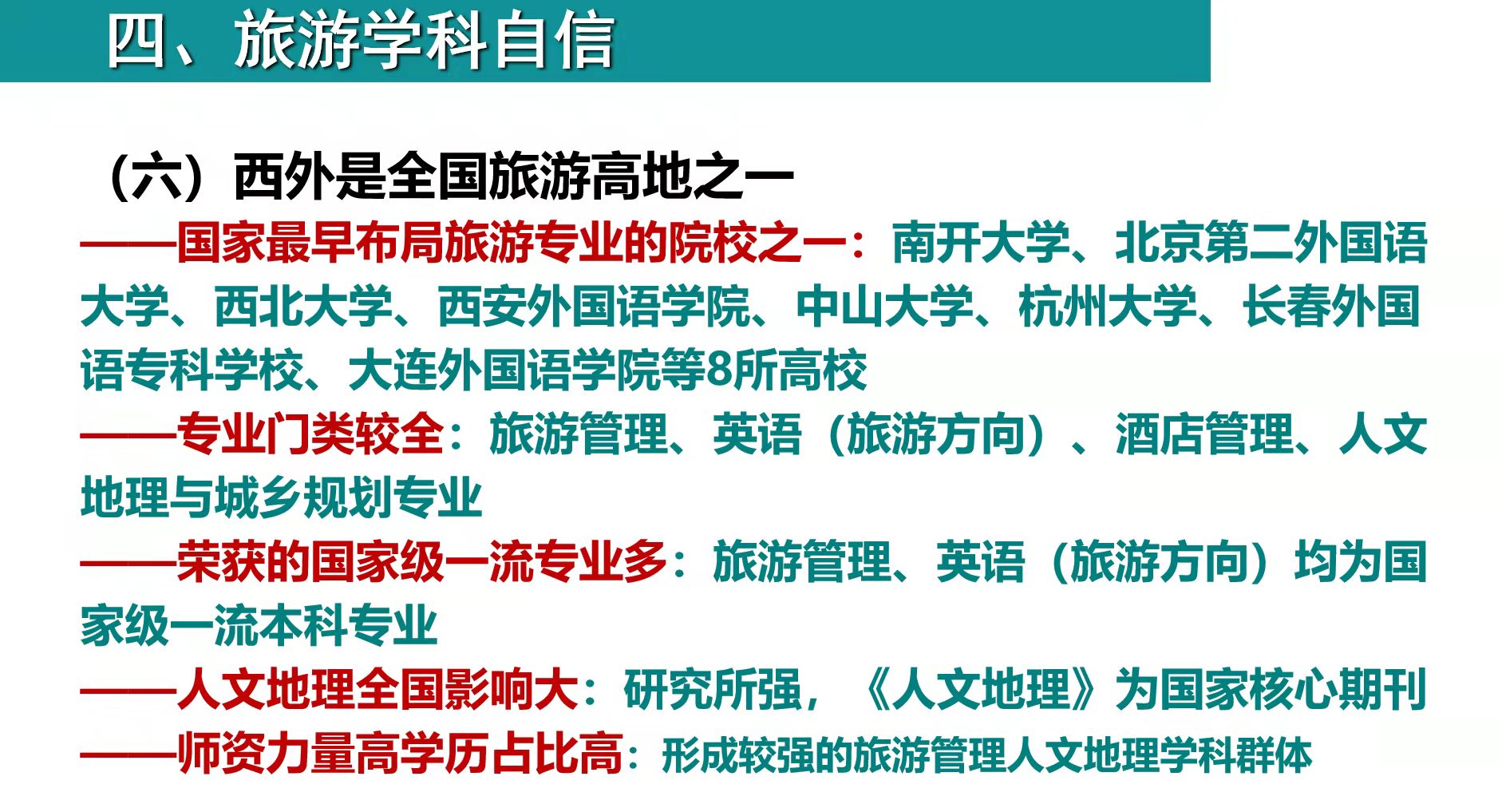 马耀峰教授以“鱼塘旅游经营模式”为例,详细向师生解读了旅游的概念、特征、旅游学定义、学科属性,并从旅游业是国家战略性支柱产业、文化和旅游部门合并、旅游作为幸福产业等多角度深入解读了旅游业的重要性,并强调37000cm威尼斯是国家最早布局旅游专业的八所高校之一、是全国旅游高地之一,结合威尼斯官网旅游管理专业的学科优势、学习目标、就业岗位、课程设置、学习方法等,对学生今后学习、就业、发展的方向给予指导和建议。