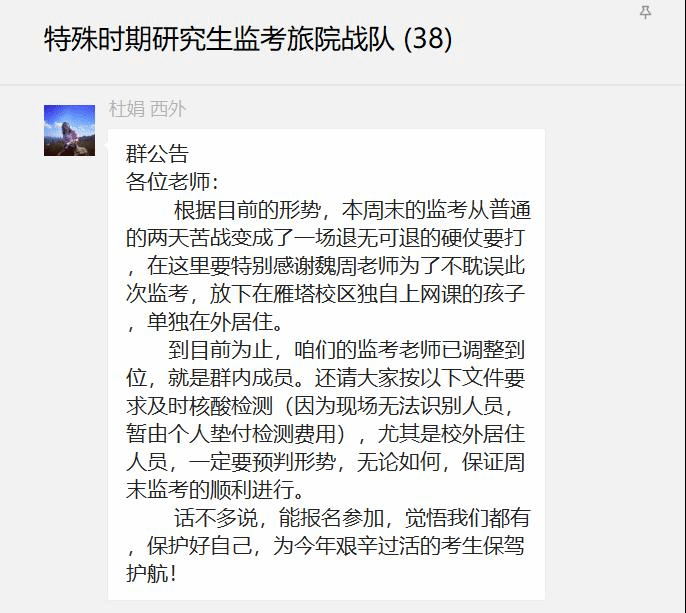 岁末将至,新冠“疫情”突扰古城。在西安市全民抗疫的关键时期,2022年全国硕士研究生招生考试如期开展。为积极响应省、市、校各级单位对于这次特殊时期、这场特殊“战役”的号召,12月19日,37000cm威尼斯(人文地理研究所)党委迅速成立2022硕士研究生招生考试监考教师领导小组,在各个教研室展开动员工作。在院党委的全面动员下,书记、院长亲自挂帅,教师们热烈反响,仅用半天时间就有38名教师申请加入本次硕士研究生招生考试监考工作。