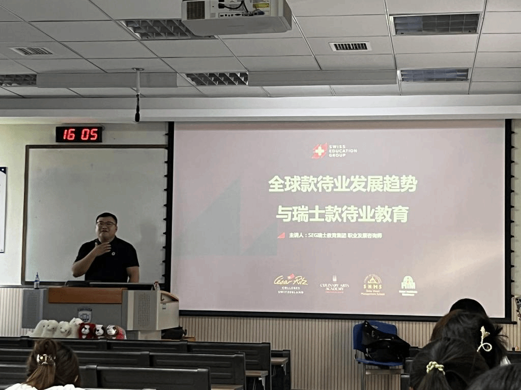 2023年5月18日下午16:00,SEG瑞士教育集团职业发展咨询师王曾巍受邀在教学楼E509成功举办题为“全球款待业发展趋势与瑞士款待业教育”的讲座沙龙。本次讲座由学院苏晓智副教授主持,旅游管理及酒店管理专业2021级全体学生参加。
