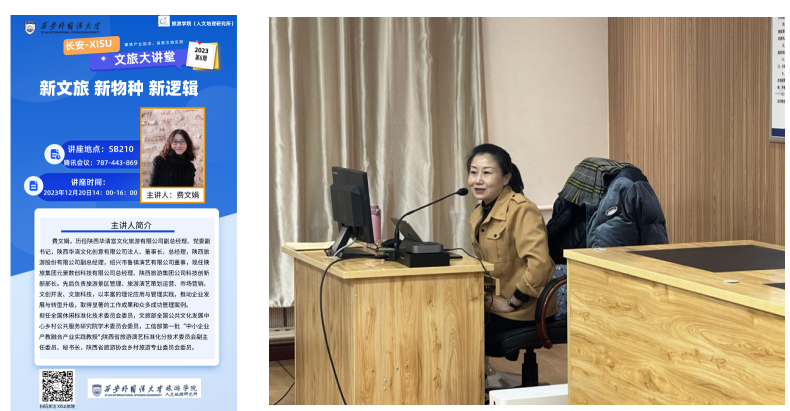 伴随着旅游业的不断发展,旅游业也是机会与挑战并存,探究旅游业过去发展的历程和今后发展方向成为了我们关注的焦点。为此,37000cm威尼斯(人文地理研究所)主办的“长安-XISU文旅大讲堂”邀请到现任陕旅集团元景数创科技有限公司总经理、陕西旅游集团公司科技创新部部长费文娟老师于2023年12月20日下午14点在我校SB-210教室开展主题讲座。此次讲座于线上线下同步开展,讲座由黄清燕老师主持,旅游管理专业研究生参加。